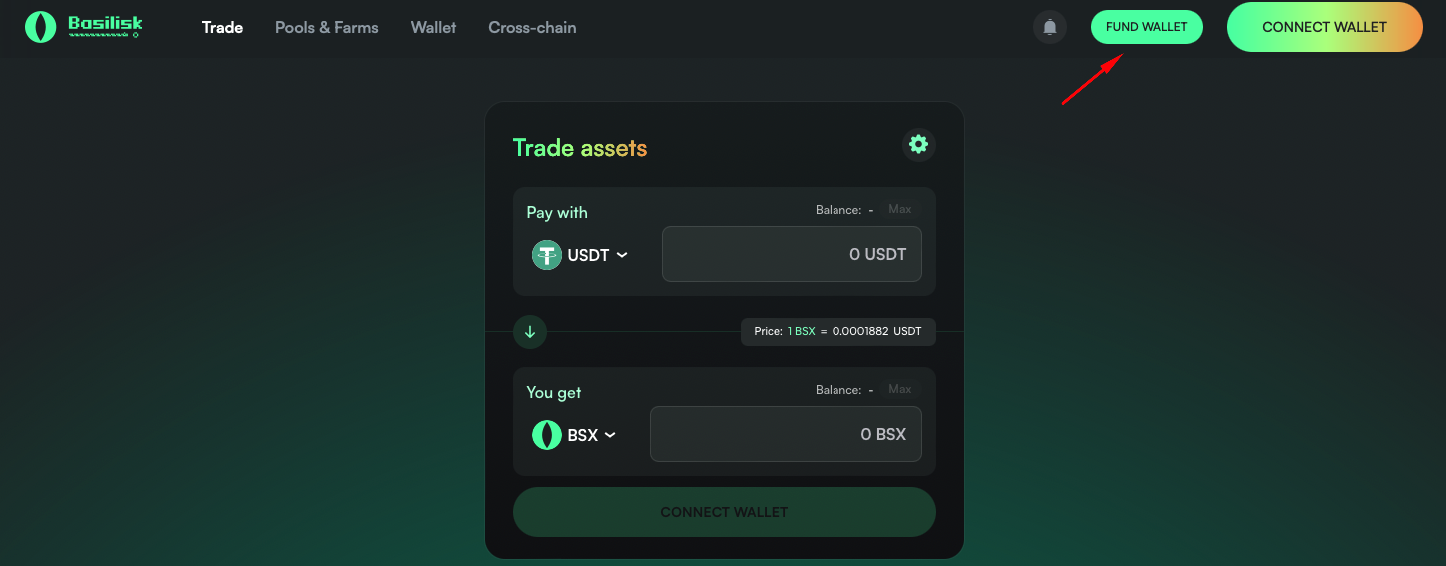 - Go to the Basilisk Dapp and click on the "Fund Wallet" Button.