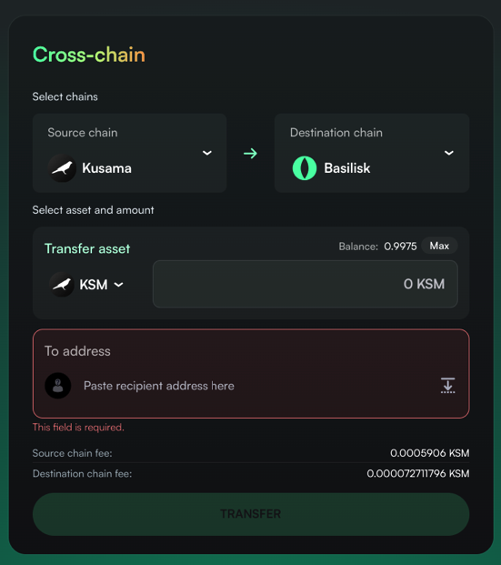 - Enter the same wallet address as selected above as the receiver if you would like to use the same wallet on Basilisk as well.