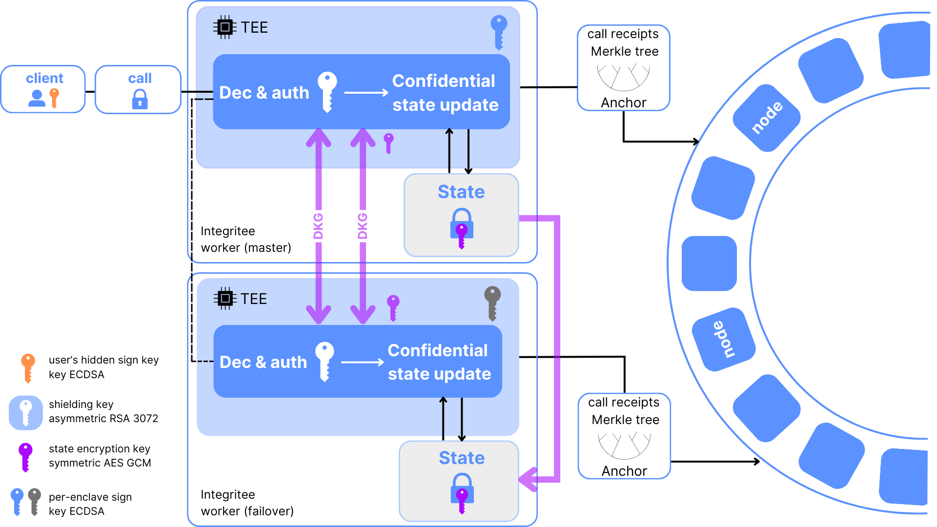 With direct invocation, a requester chooses one of the sidechain validators to send her trusted call to over an encrypted channel. The validator produces a sidechain block, executing pending transactions. The block gets finalized on the Integritee parachain and the state diff is broadcast to the other validators, who simply apply the diff to their copy of the state. The sidechain validators produce blocks with a customizable block time T and broadcast them to the other validators. Should a validator fail to broadcast a block (or the block doesn’t reach the next validator) that validator is skipped after a timeout.