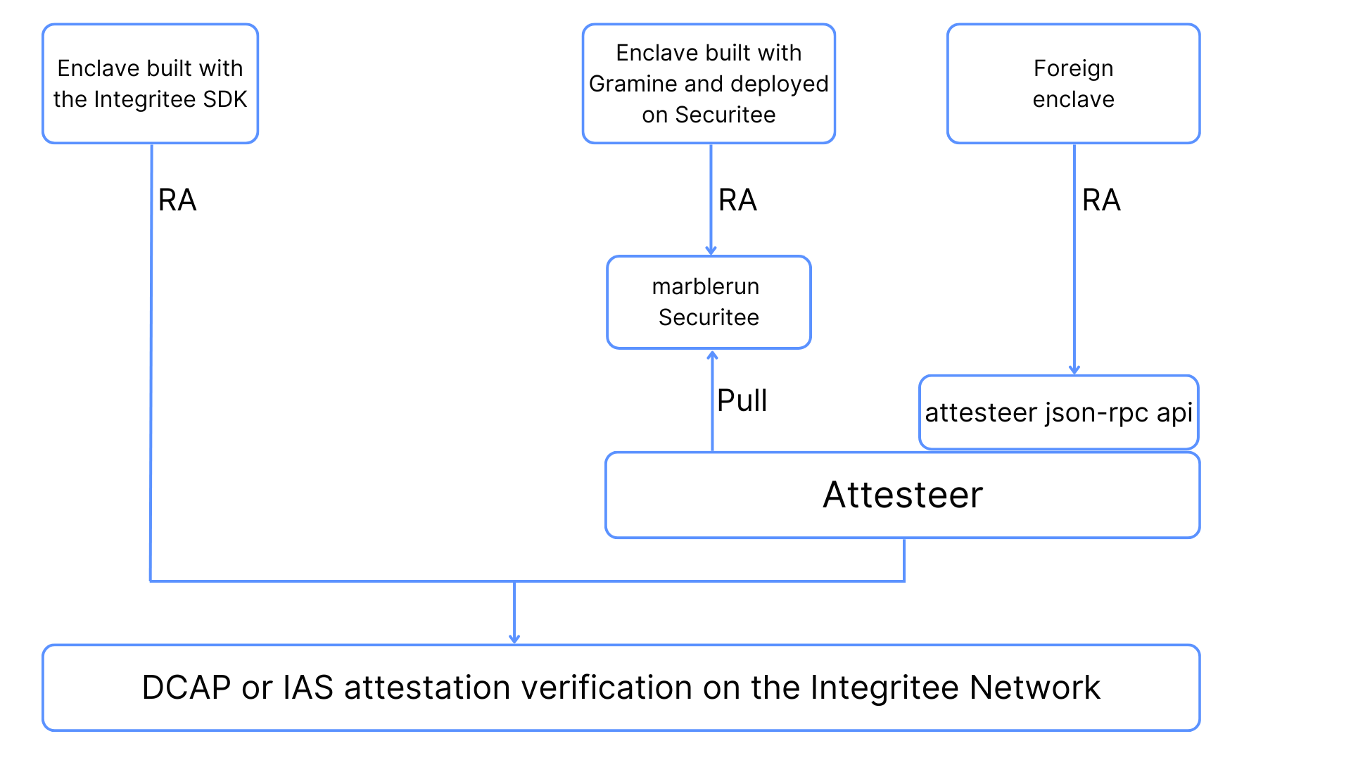 - If you build your enclave based on our SDK, you don't need the Attesteer because your enclave will be sovereign; it can interact with the Integritee Network to do DCAP attestation independently.